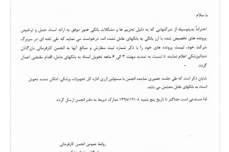 نامه انجمن صنفی تجهیزات و ملزومات دندانپزشکی به مدیرکل اداره کل تجهیزات پزشکی