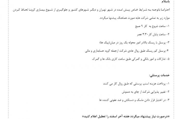 احتراما با توجه به شرایط خاص پیش آمده در شهر تهران و