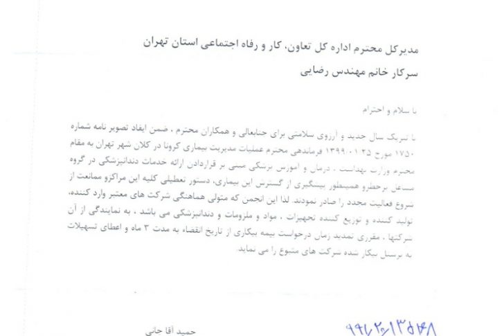 نامه انجمن صنفی تجهیزات و ملزومات دندانپزشکی به مدیرکل اداره کل تعاون،کار و رفاه اجتماعی استان تهران